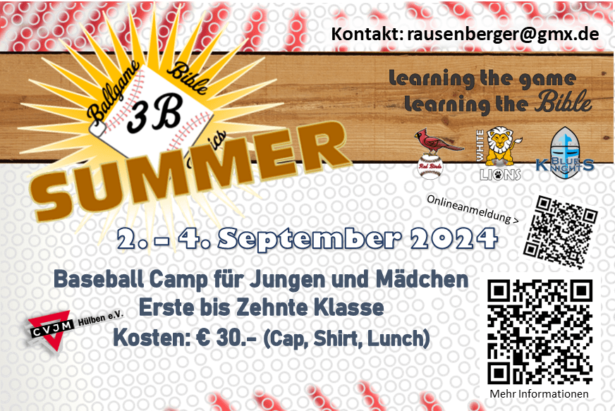 01-09-2024 Der Sommer beginnt morgen – die Coaches und Mitarbeiter des 3B SUMMER Camp 2024 begrüßen morgen 18 Teilnehmer auf dem Etzenberg. Neben den Grundlagen des Baseballs lernen die Teilnehmer auch mehr über Gott, den Vater. Nach einem Lunch gibt es Ballgame satt – die Teilnehmer spielen um Hits, Runs und Outs. Tagesaktuell gibt es hier kurze Berichte und Bilder.