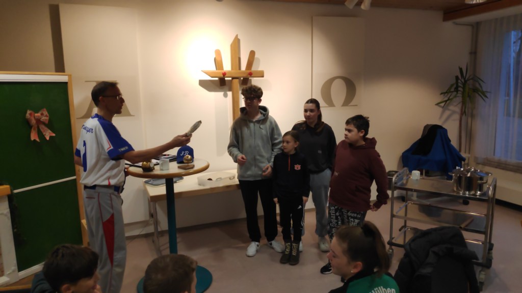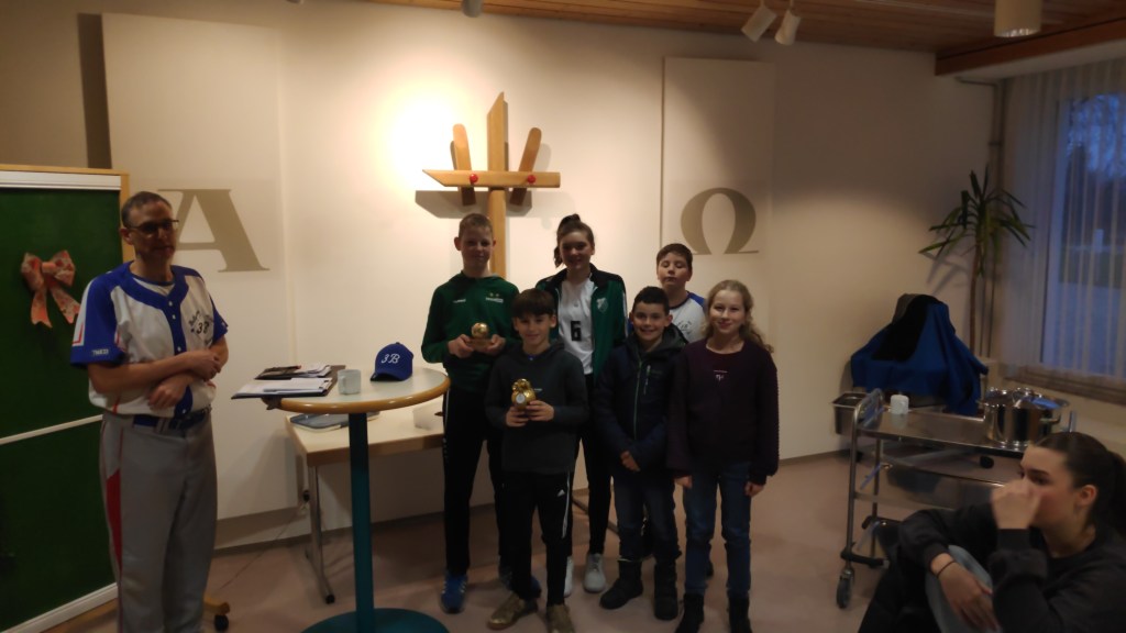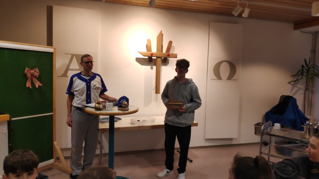 Nach dem Spieltag ging es in das weihnachtlich geschmückte Ev. Gemeindehaus zur BibleTime, bei der die Spieler von Richter Ehud lernten. Das Leben dieses wenig bekannten Richters deutet auf Jesus: Ehud erschlug den Unterdrücker Eglon, so wie Jesus den Kopf der Schlange zertrat (1 Mose 3: 15). Und so wie die Israeliten nicht erkannten, dass sie nun frei waren, erkennen auch heute noch Menschen nicht, dass sie durch Jesus‘ Tod am Kreuz Freiheit von Sünde und deren Abhängigkeiten haben können. Ehud blies die Posaune und dieser Klang rief die Israeliten zum Kampf gegen Moab, das sie daraufhin besiegten und dann Freiheit und Frieden erlebten. Genauso wird Jesus beim lauten Klang einer Posaune wieder kommen (1 Thessalonicher 4: 16) – daran denken wir jetzt im Advent. Für Menschen die an Ihn glauben kommt Jesus dann nicht als Richter, sondern als Retter – auch im Buch der Richter finden wir die gute Nachricht von Advent und Weihnachten.